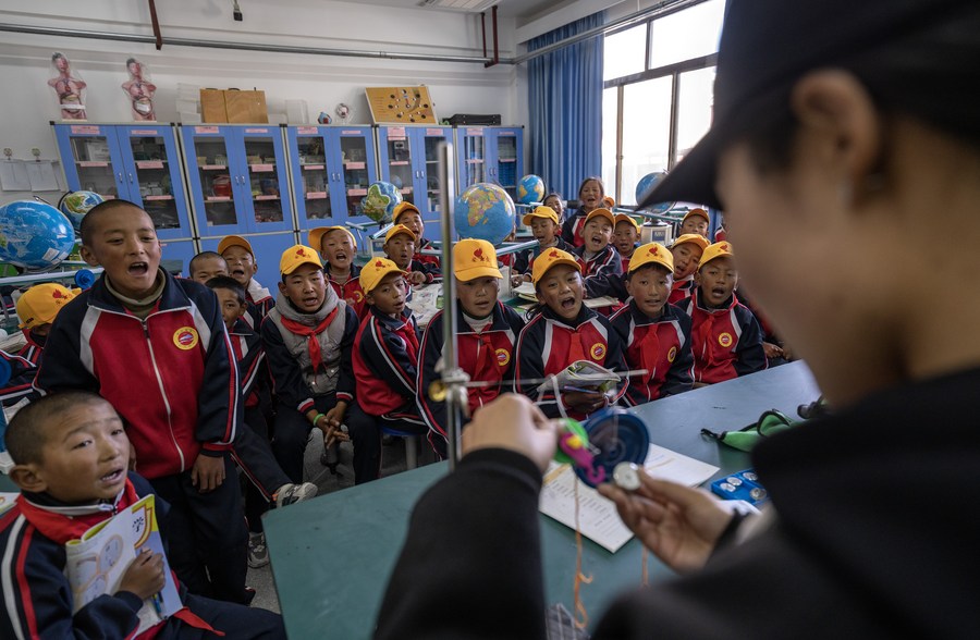 6月5日,扎西宗鄉(xiāng)完全小學的副校長旦巴仁青在給學生上科學課。