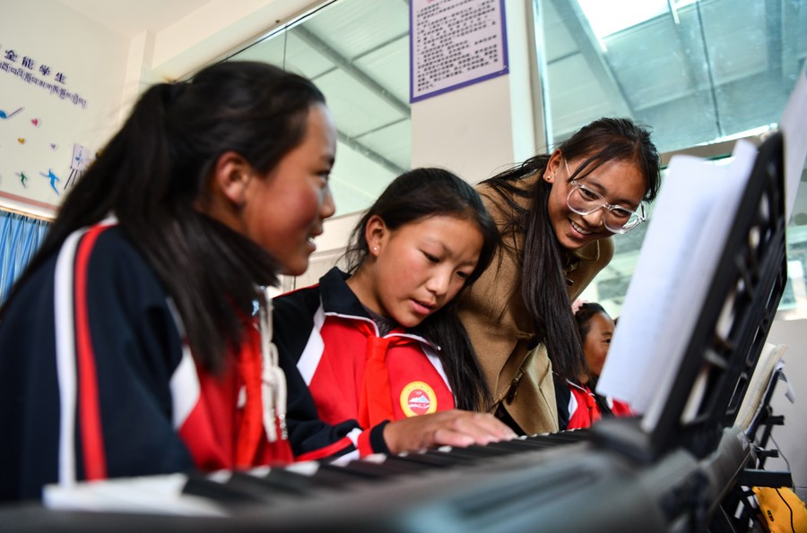 6月5日,扎西宗鄉(xiāng)完全小學的鋼琴課老師巴桑(右)在給學生指導指法?! ?/p>
