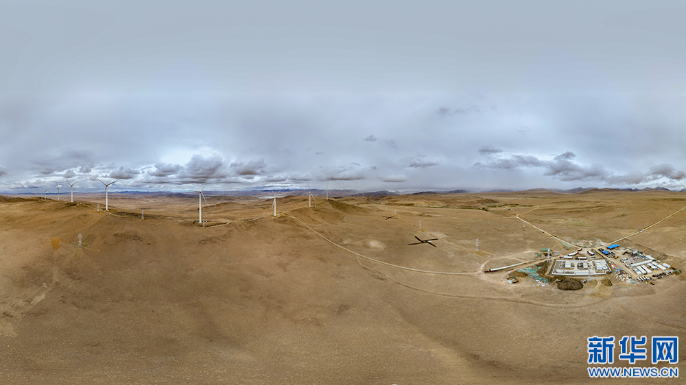 6月9日拍攝的西藏措美哲古風(fēng)電項(xiàng)目風(fēng)電機(jī)組和西藏措美哲古風(fēng)電廠(無人機(jī)全景照片)。新華網(wǎng) 旦增努布 攝