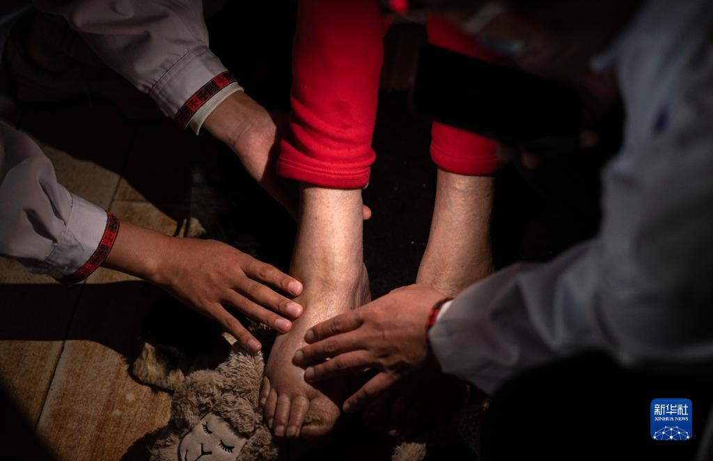 6月12日,王振疆(右二)在查看次仁旺姆的手指關(guān)節(jié)。新華社記者 費(fèi)茂華 攝