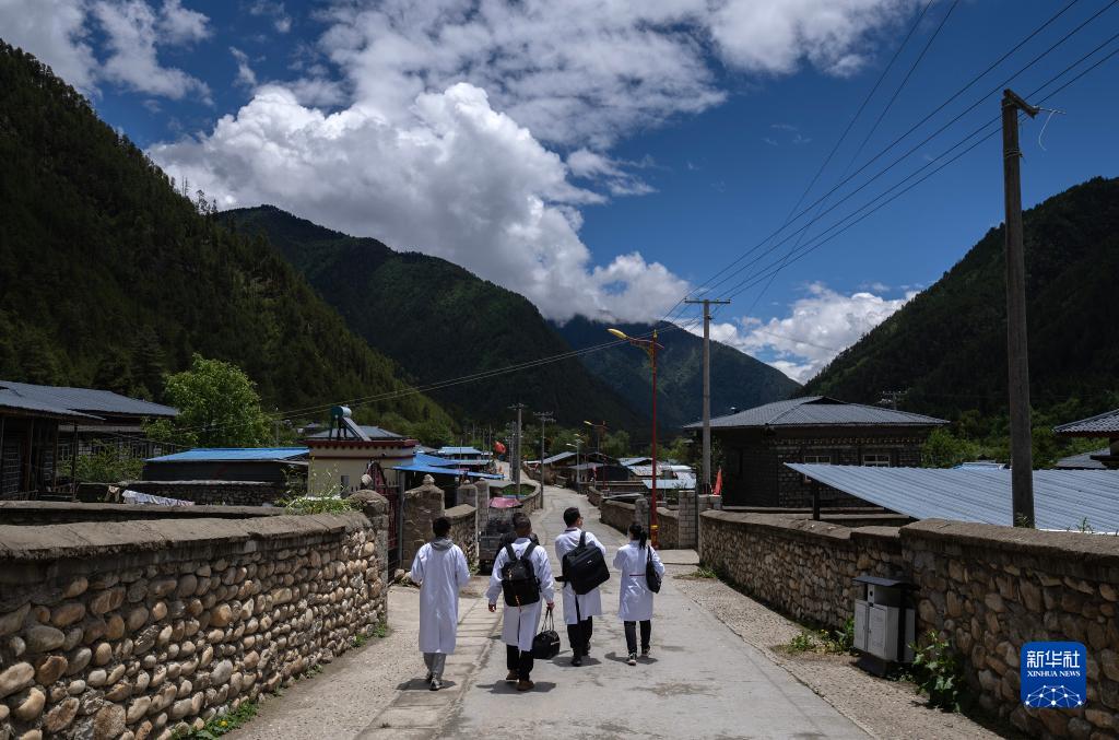 6月12日,入戶診治結(jié)束后,王振疆(左二)、王彤旭(右二)、陳冰(右一)和尼瑪益西走向村委會(huì)。新華社記者 費(fèi)茂華 攝