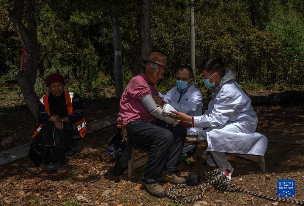 6月12日,王振疆(右)為吞不絨村89歲的村民娘姑進(jìn)行檢查。新華社記者 費(fèi)茂華 攝