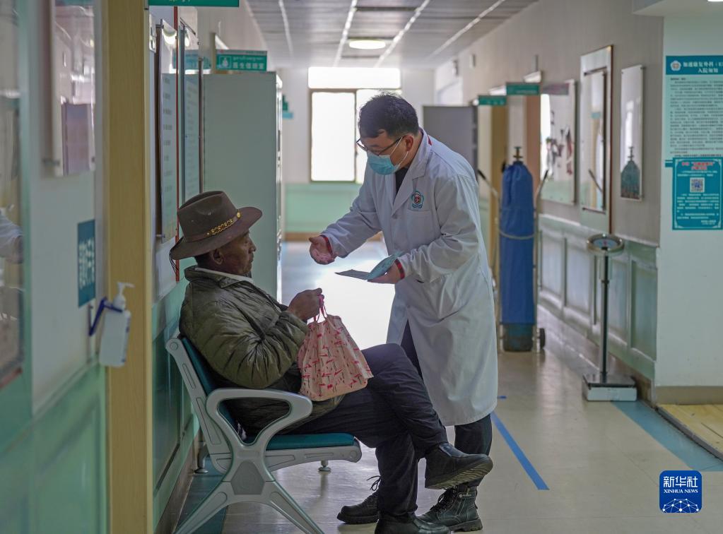 6月12日,王彤旭醫(yī)生在米林市人民醫(yī)院走廊里詢問患者病情恢復(fù)情況。新華社記者 邵澤東 攝