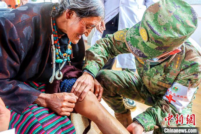 圖為醫(yī)療隊軍醫(yī)來到格桑措姆老人的家中為她檢查膝蓋疼痛問題。 朱文秀 攝