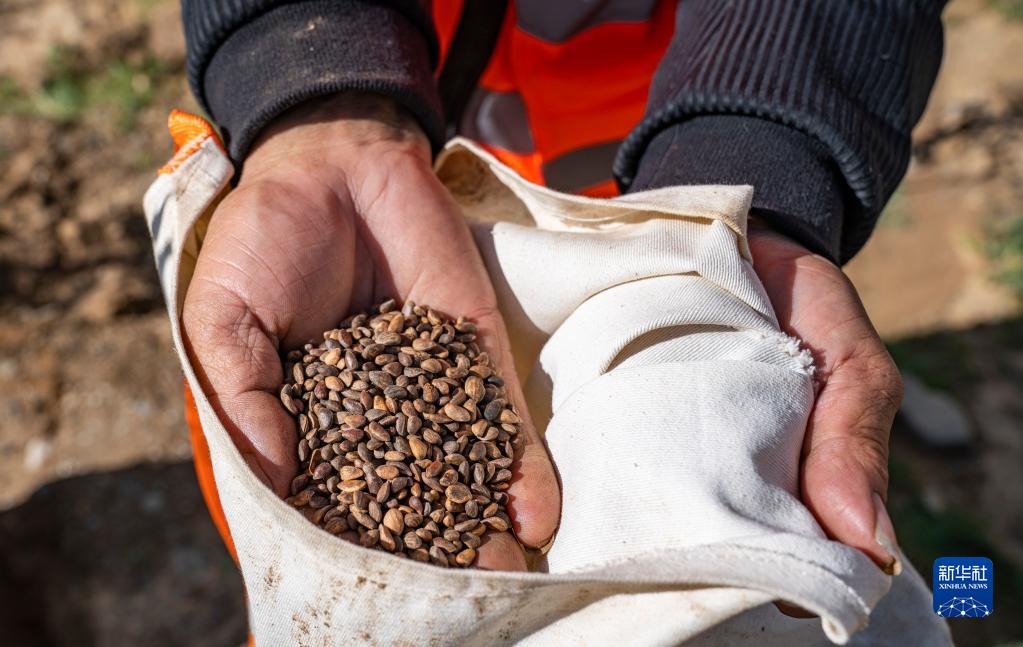 工人展示待播撒的油松種子(6月18日攝)。新華社記者 孫非 攝