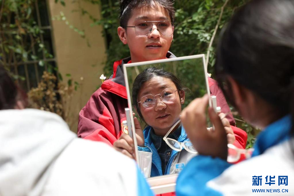 ?? 在西藏自治區(qū)那曲市色尼區(qū)第二中學(xué)(杭嘉中學(xué)),志愿者狄璐琬正引導(dǎo)戴上試戴架的學(xué)生適應(yīng)眼鏡清晰度(6月22日攝)。新華社發(fā)(趙穎碩 攝)