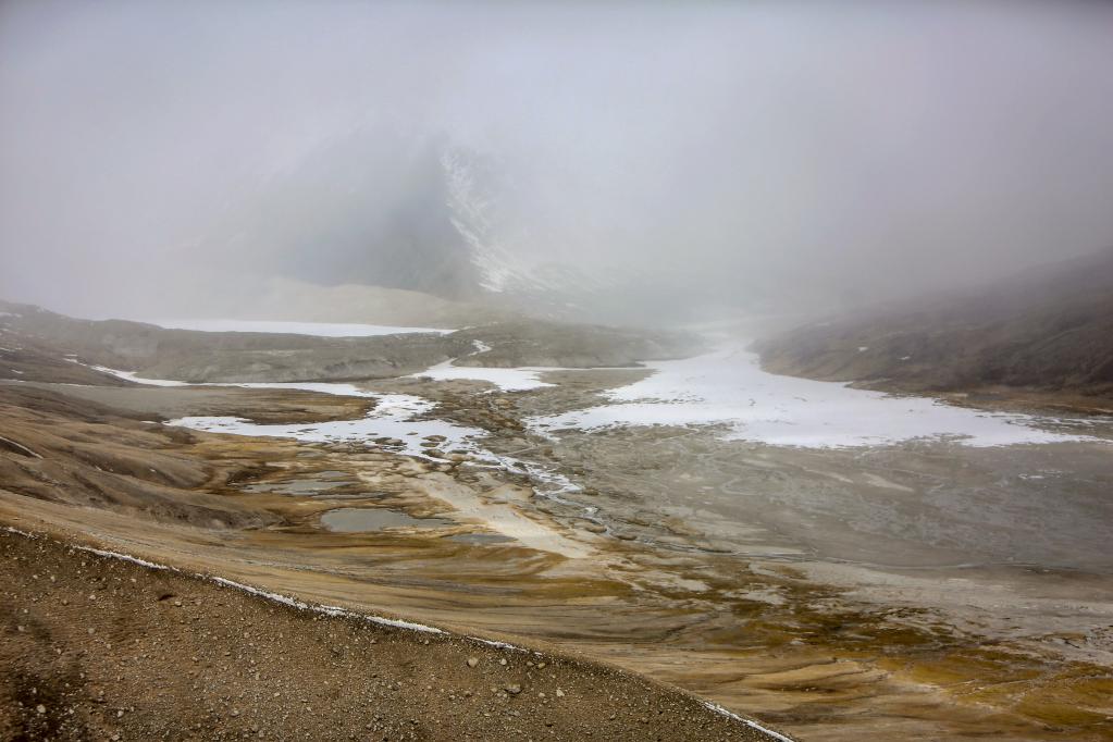 如果說札達(dá)土林和古格王國(guó)遺址給人的印象可以用宏偉壯觀來形容的話,那么雅魯藏布江發(fā)源地——杰瑪央宗冰川給人帶來的則是蕭瑟與遼闊的景象。我們趕到杰瑪央宗冰川的時(shí)候風(fēng)雪交加。凜冽的寒風(fēng)呼呼地刮在臉上像刀割一樣,風(fēng)吹得人幾乎睜不開眼睛。作為本次報(bào)道的視頻記者之一,我當(dāng)時(shí)最擔(dān)心的是機(jī)器拿不穩(wěn),拍攝畫面出現(xiàn)抖動(dòng)的情況,所以拍攝全程我都把手中的相機(jī)攥得很緊。