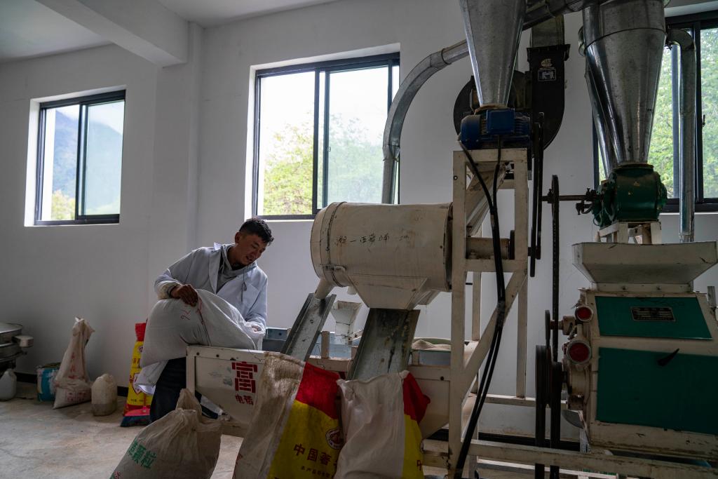 在吉巴鄉(xiāng)吉巴村蕎麥種植加工農(nóng)牧民專業(yè)合作社,一名員工正在加工蕎麥(6月27日攝)。新華社記者 孫非 攝