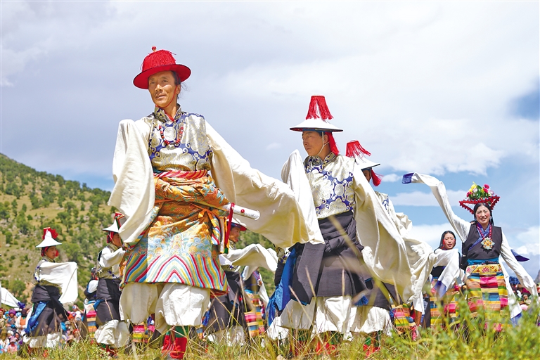 7月的林周縣唐古鄉(xiāng)綠草如茵,草地上點綴著藍(lán)色和黃色的野花。演員們以藍(lán)天白云為幕,伴隨著優(yōu)美的橫笛聲,跨出豪邁步伐,跳起了“熱振曲卓”?!盁嵴袂俊?,是林周人民智慧的結(jié)晶,在滄海桑田的變化中見證著這片土地的故事。