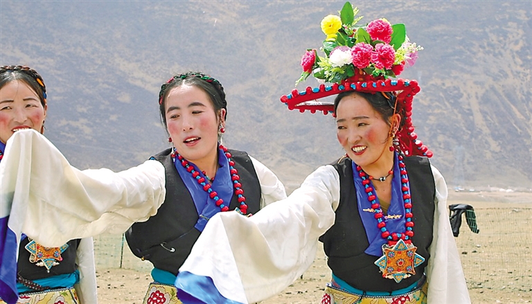 “熱振曲卓”文藝演出隊女演員表演舞蹈。