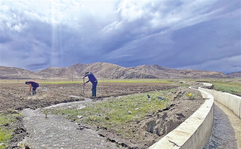 圖為浪卡子縣多卻鄉(xiāng)亞如村群眾正在從干渠引水灌溉農(nóng)田。記者 丹增平措 見(jiàn)習(xí)記者 武沛濤 攝