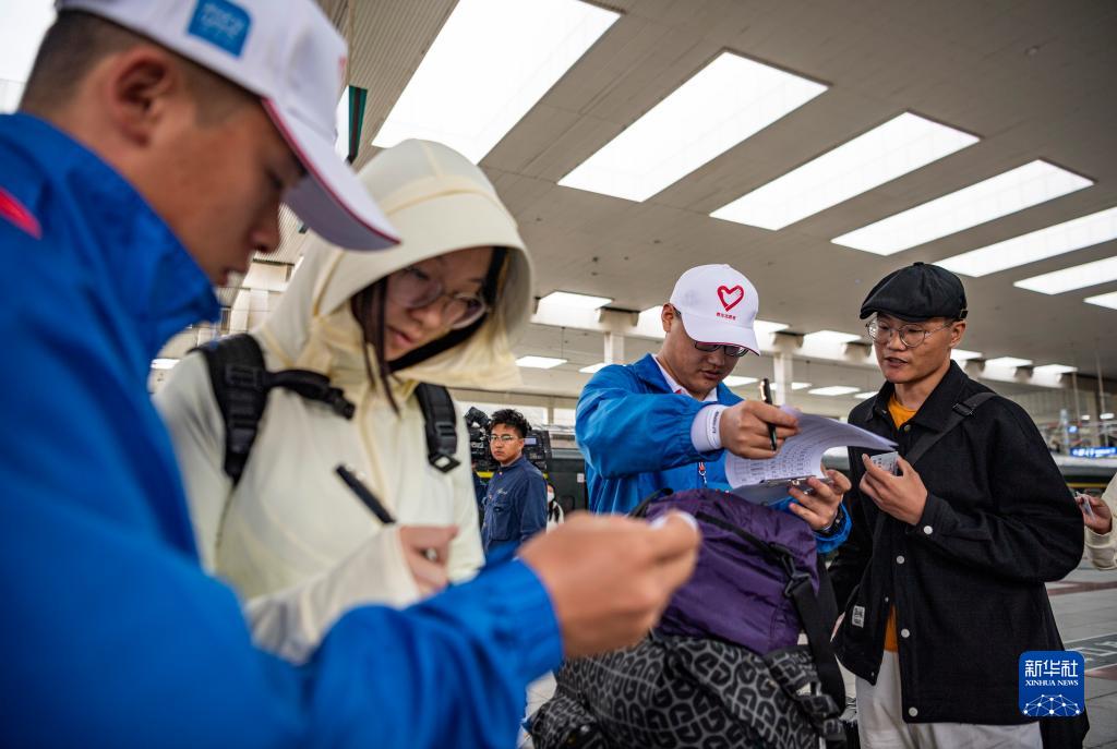 7月24日,在拉薩火車站,工作人員為抵達拉薩的志愿者登記信息。新華社記者 孫非 攝