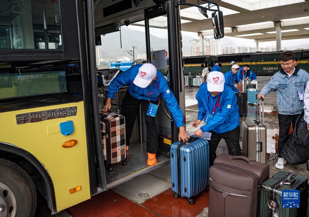 7月24日,在拉薩火車站,工作人員幫剛剛抵達拉薩的志愿者搬運行李。新華社記者 孫非 攝