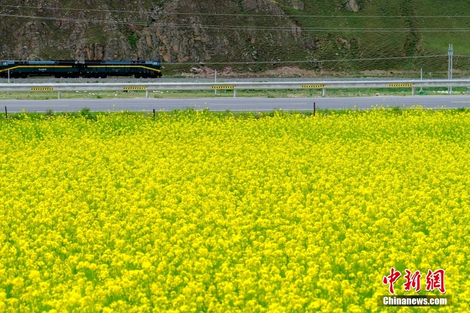 7月24日,青藏鐵路火車通過堆龍曲沿岸的油菜花田。