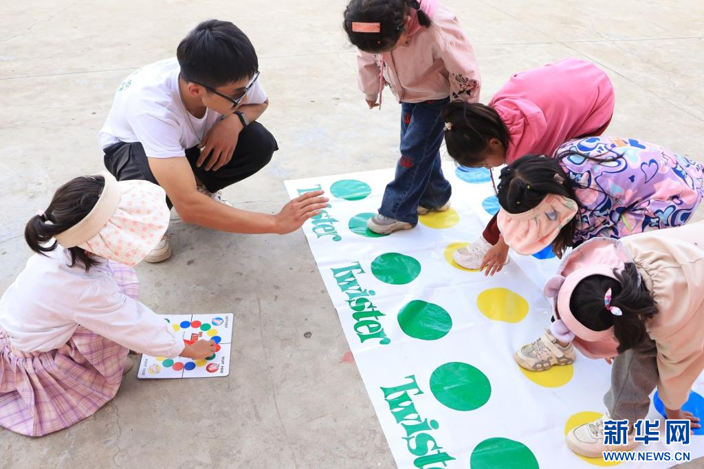 中國農業(yè)大學峰云社人文科考隊隊員帶領孩子們進行課外活動。新華社發(fā)