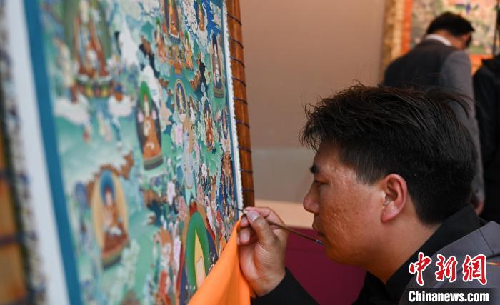 圖為活動現場,唐卡畫師展示唐卡繪制。趙朗 攝