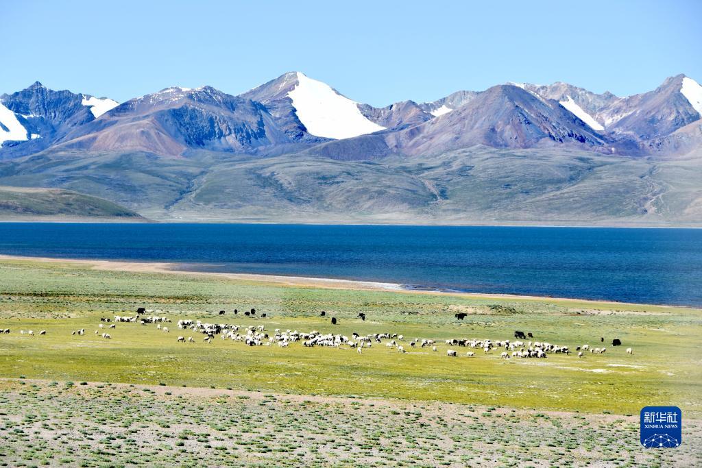 打加錯(cuò)湖畔的羊群、牛群(8月30日攝)。新華社記者 劉文博 攝