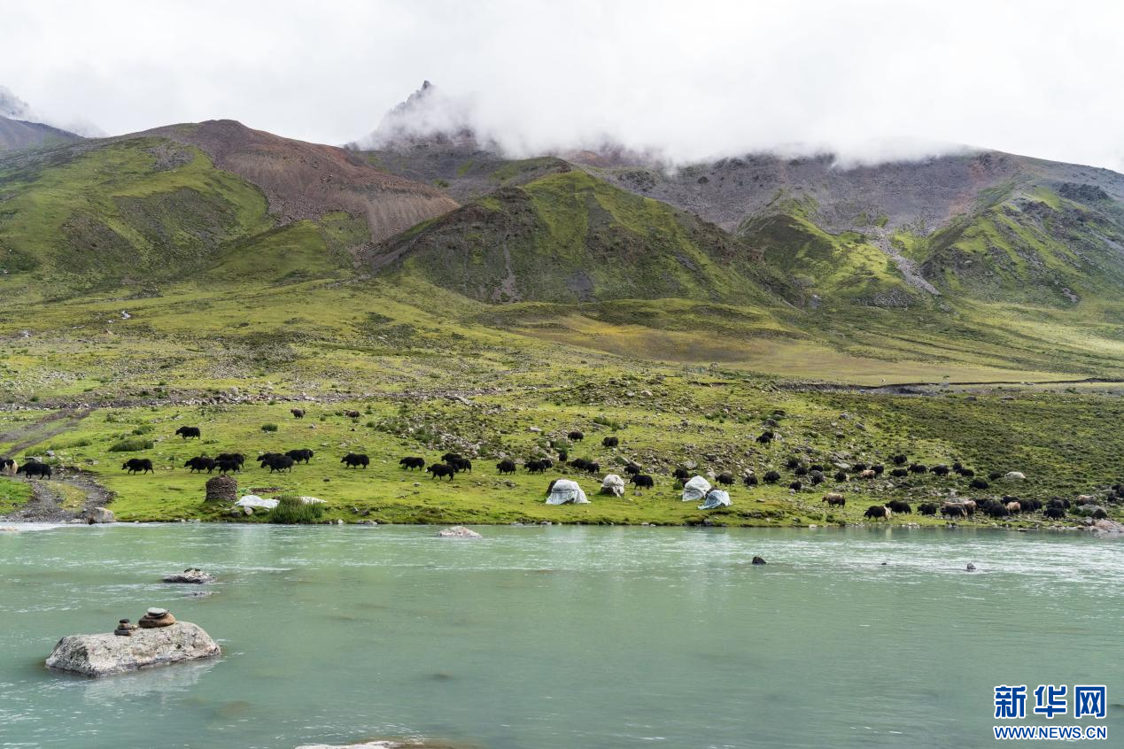 圖為湖邊悠閑吃草的牦牛(8月27日攝)。 新華網(wǎng)發(fā) 蘇思源 攝