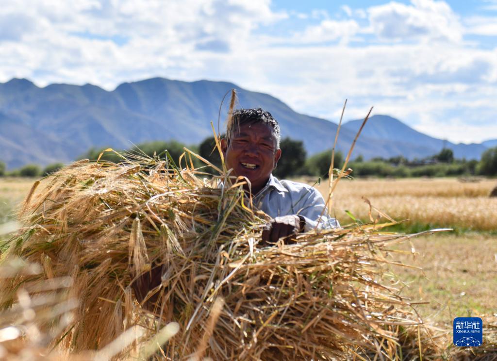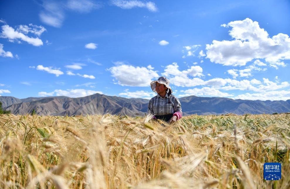 西藏日喀則市年楚河流域是西藏糧食的主產(chǎn)區(qū)之一,今年雨水豐沛,糧食長勢喜人,大地鋪金,農(nóng)民喜迎豐收。