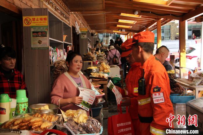 圖為消防員正在為景區(qū)商戶普及防火知識(shí)。西繞拉翁 攝