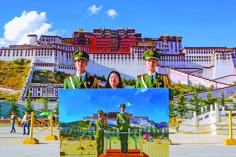 圖為青年畫(huà)家劉雪萍與執(zhí)勤哨兵在布達(dá)拉宮前合影。記者 格桑倫珠 攝