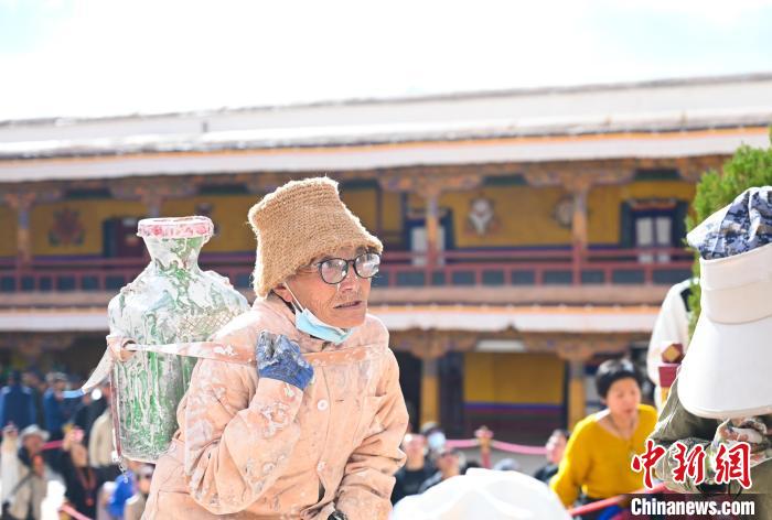參與到粉刷中的民眾有序運送或潑灑涂料。快70歲的丹巴渾身沾滿了白色涂料,小憩間盤腿席地而坐,正在喝甜茶的他,還不忘熱情招呼記者品嘗。這位老人原是布達拉宮的木匠,工作了28年。退休后,每年布達拉宮粉刷,他幾乎都要來參加,覺得來布達拉宮像回家一樣親切。他說:“以前都是口頭通知喊大家過來,現(xiàn)在網(wǎng)上一發(fā)消息,大家都主動參加。”