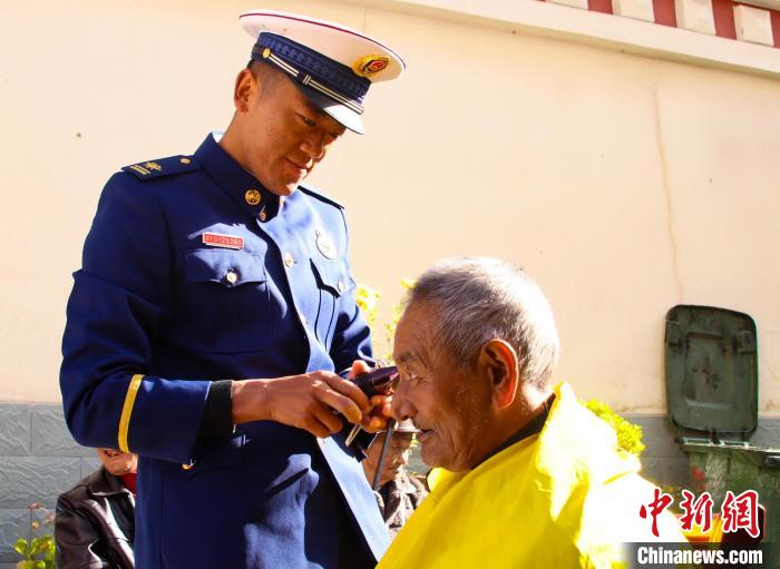 圖為林芝市森林消防支隊(duì)波密中隊(duì)消防員正在為老人理發(fā)。馮怡凡 攝