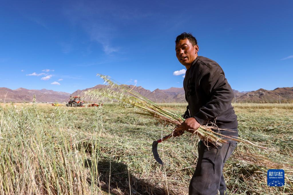 10月24日,拉薩市林周縣強嘎鄉(xiāng)曲嘎強村村民阿旺旦增在自家田壟邊收割牧草。新華社記者 姜帆 攝