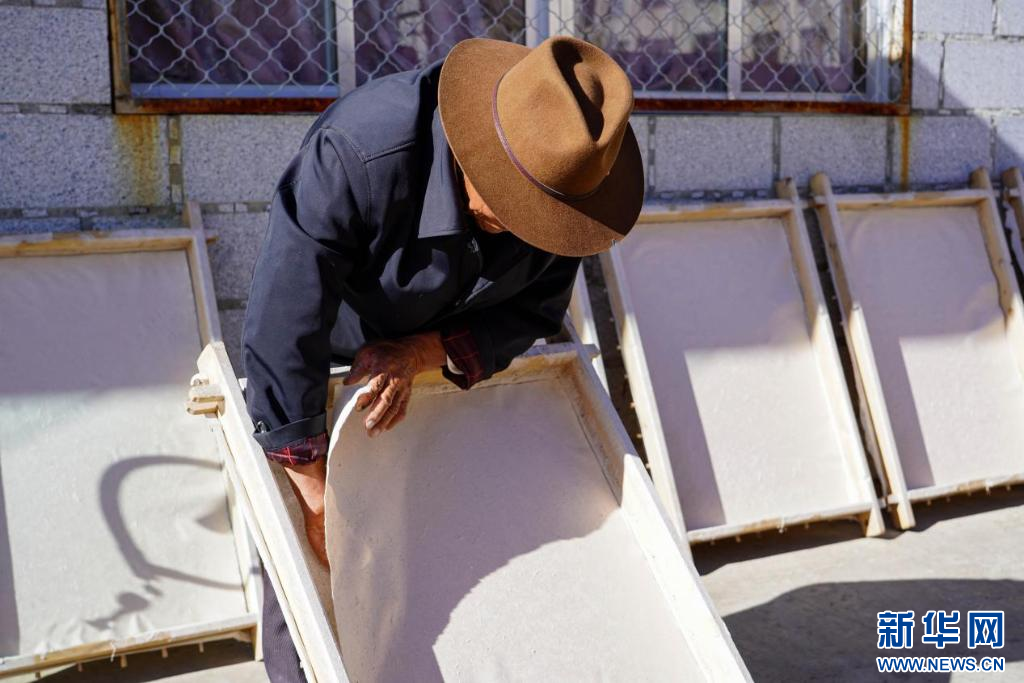 圖為次仁多杰進行澆造、抄紙工藝步驟(10月20日攝)。新華網發(fā) 司秦菱 攝