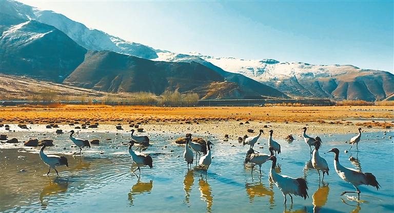 黑頸鶴在巴嘎雪濕地棲息。