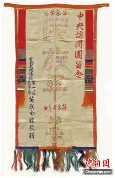 國家民委主辦的“鑄牢中華民族共同體意識文物古籍展”正在民族文化宮展出。圖為展覽中展出的新中國成立后云南省西疇縣第一區(qū)長箐鄉(xiāng)苗族全體敬獻(xiàn)中央訪問團(tuán)的錦旗。民族文化宮供圖