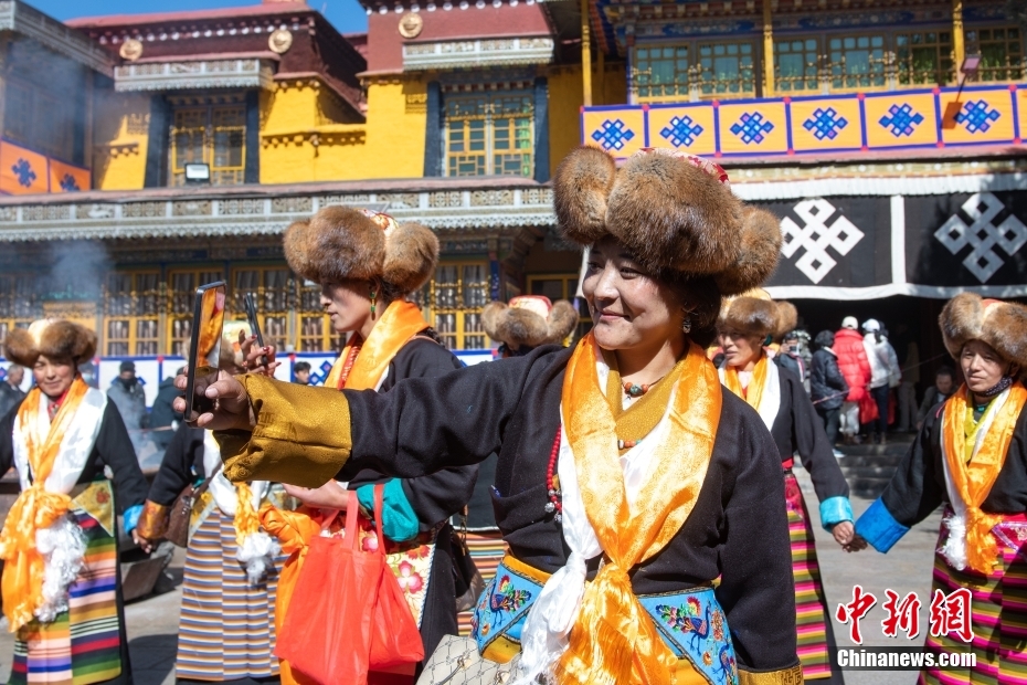 11月15日,西藏拉薩,拉薩婦女在扎基寺跳起傳統(tǒng)舞蹈,迎“仙女節(jié)”?!跋膳?jié)”即吉祥天母節(jié),藏語(yǔ)稱“白來(lái)日追”。相傳藏傳佛教最高護(hù)法神之一班丹拉姆的女兒白拉姆,不顧母親的反對(duì)與赤尊贊私定終身,班丹拉姆一怒之下將赤尊贊趕到拉薩河南岸,規(guī)定二人僅每年的藏歷十月十五日相見(jiàn)。中新社記者 貢嘎來(lái)松 攝