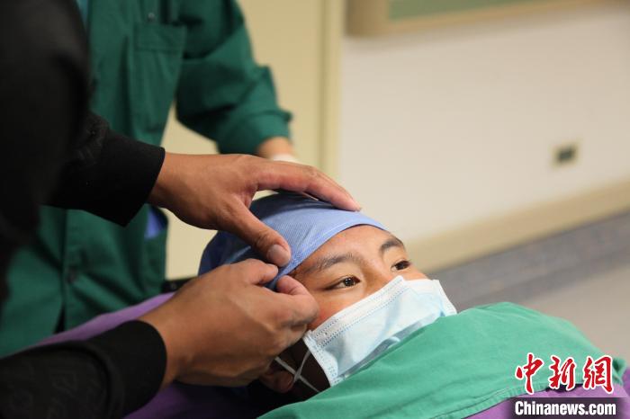 11月21日上午,扎著兩只麻花辮的澤巴永宗即將在北京大學(xué)第一醫(yī)院接受脊柱側(cè)凸矯形手術(shù),要進(jìn)手術(shù)室時(shí),哥哥貢布鄧珠幫她將額角的頭發(fā)掖進(jìn)手術(shù)帽中。中新網(wǎng)記者 朱賀 攝