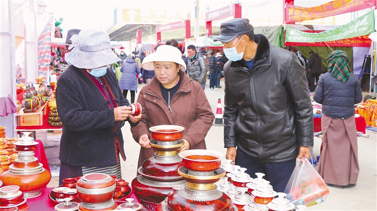 物交會現(xiàn)場,記者看到,各式各樣的特色產(chǎn)品琳瑯滿目,有來自山南市隆子縣熱榮鄉(xiāng)加繞村的牛肚、昌都市江達(dá)縣江達(dá)鎮(zhèn)的木碗、林芝市工布江達(dá)縣的唐卡刺繡……在尼泊爾商家的攤位前,也站滿了眾多市民參觀選購。