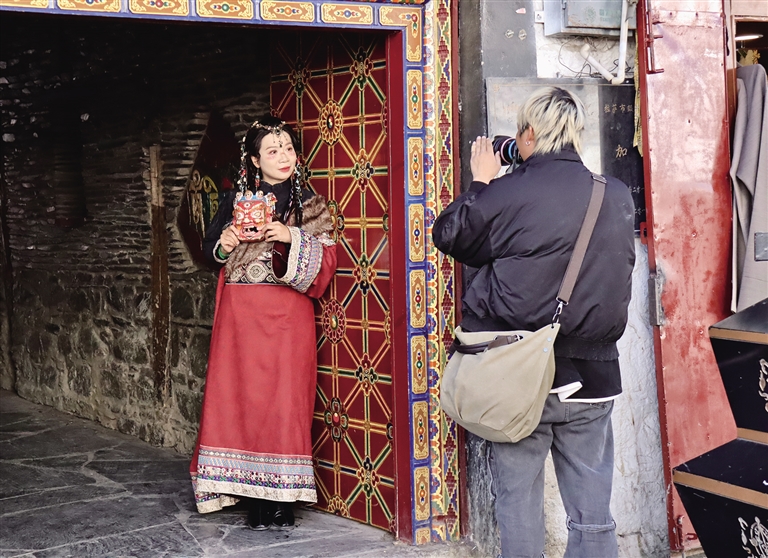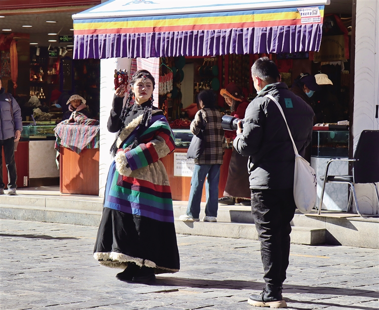 八廓街內(nèi)體驗(yàn)藏裝寫真的游客。記者 張琳 攝