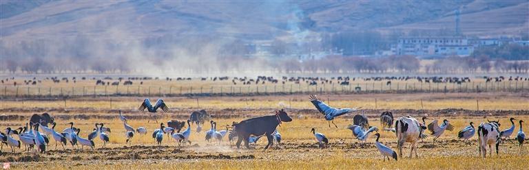 林周縣春堆鄉(xiāng)春堆村的黑頸鶴。通訊員 南木加 攝
