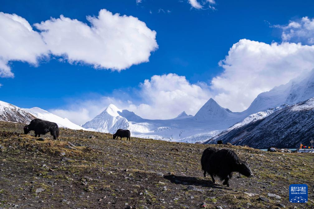 牦牛在那曲市比如縣羊秀鄉(xiāng)薩普雪山腳下的草場(chǎng)上吃草(10月28日攝)。新華社記者 孫非 攝