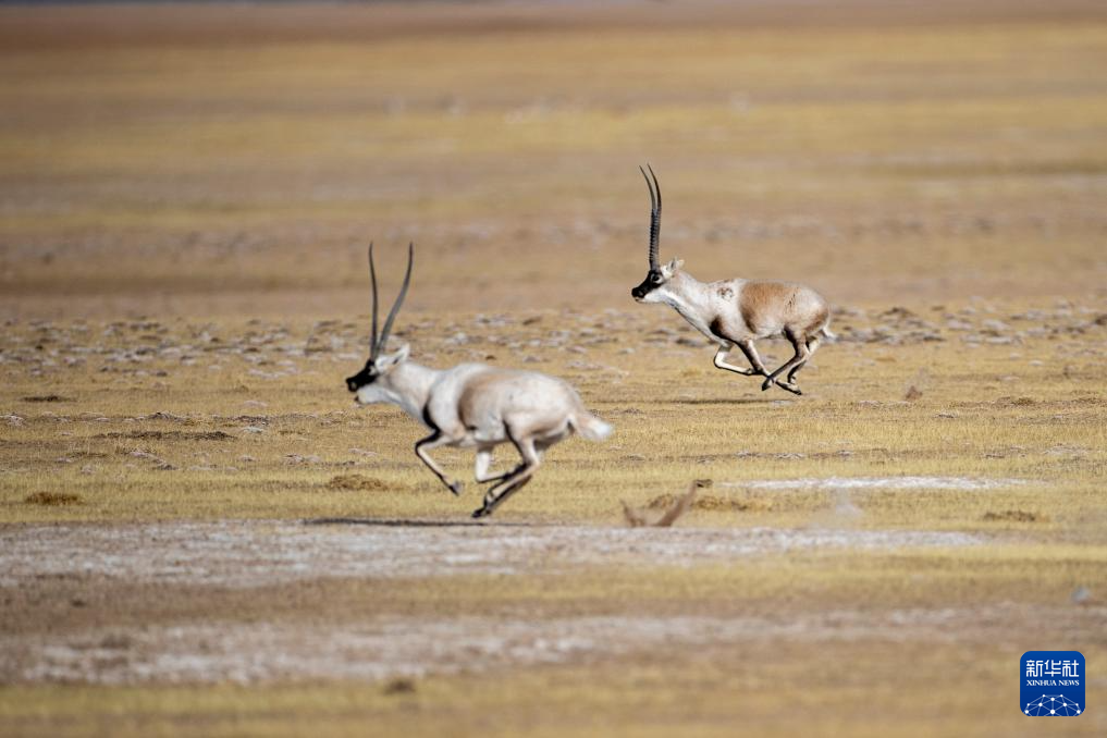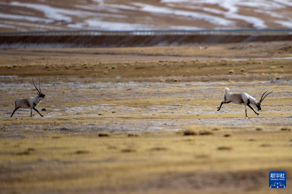 在羌塘國家級自然保護區(qū),兩只雄性藏羚羊為爭奪交配權而相互追逐(12月16日攝)。新華社發(fā)(旦增努布 攝)