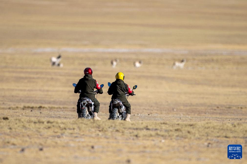 在羌塘國家級自然保護區(qū),野生動物管護隊員騎著摩托車觀察藏羚羊(12月17日攝)。新華社記者 姜帆 攝