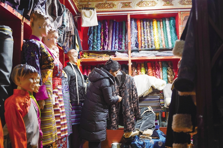 “最近越來越冷了,所以我今天來給女兒買一件厚點的藏裝,剛好她生日也快到了?!弊哌M位于北京東路的222藏裝店,琳瑯滿目、顏色絢麗的冬款藏裝讓人眼前一亮,市民尼瑪拉姆正在給女兒挑選藏裝。一旁,店員則在給客人測量三圍、取藏裝、介紹款式,忙得不可開交。