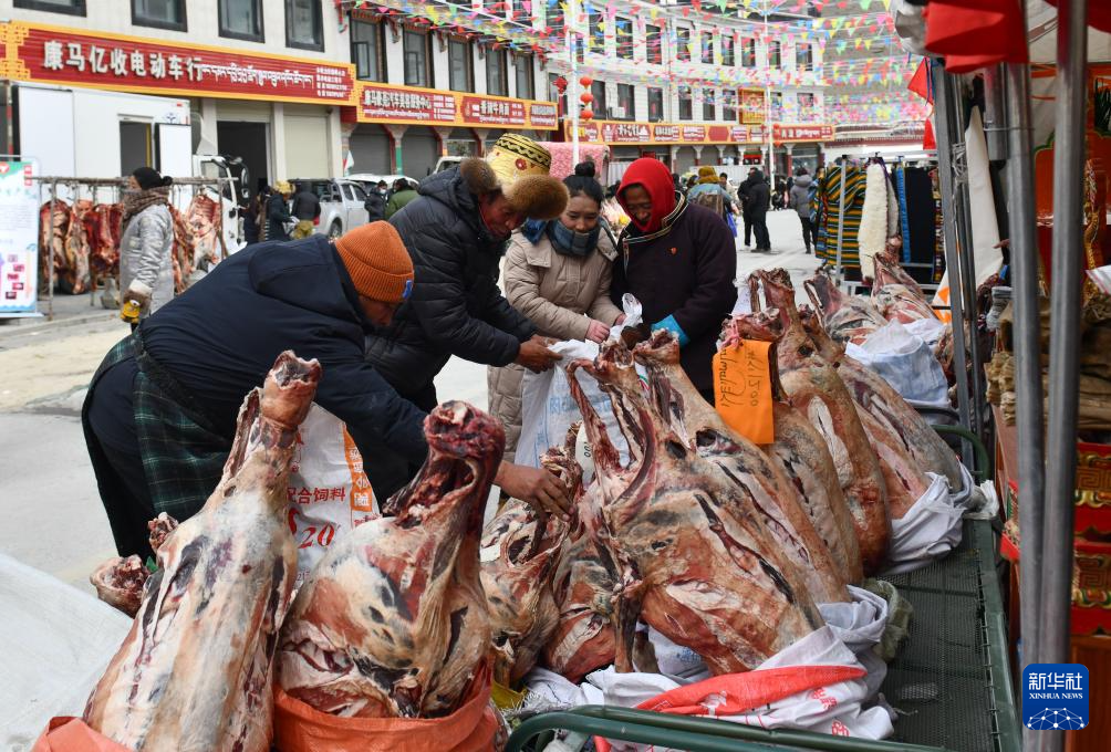 12月13日,在西藏日喀則市康馬縣冬季物資文化交流會上,當?shù)厝罕娫谫徺I羊肉。新華社記者格桑朗杰 攝