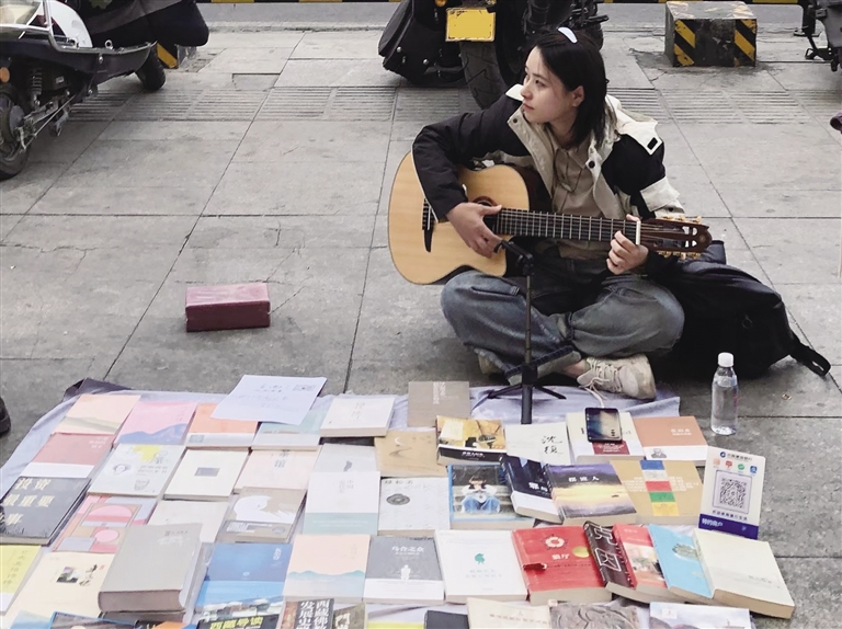 一般出攤時間是下午6點(diǎn)到9點(diǎn),天氣暖和的話會到晚上10點(diǎn)左右才收攤。買書的顧客還是當(dāng)?shù)氐哪贻p人多一點(diǎn),游客倒沒有多少,生意也時好時壞,有時候一天能賣八九百元,有時候一晚上只能賣出去一本書。在沒有顧客的時候,方思潔就坐在攤位看書,“有時看了一半的書被顧客買走,我心里好著急,心想著還沒看完,想知道后面的故事?!彼J(rèn)為,擺地攤是展示自我的一種方式。