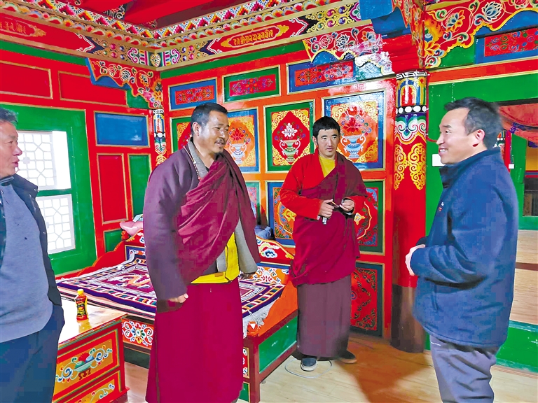 2023年11月17日,自治區(qū)人大代表段世昌(右)在昌都市江達(dá)縣汪布頂鄉(xiāng)根沙寺了解寺廟“三個(gè)意識(shí)”宣傳教育開展情況。