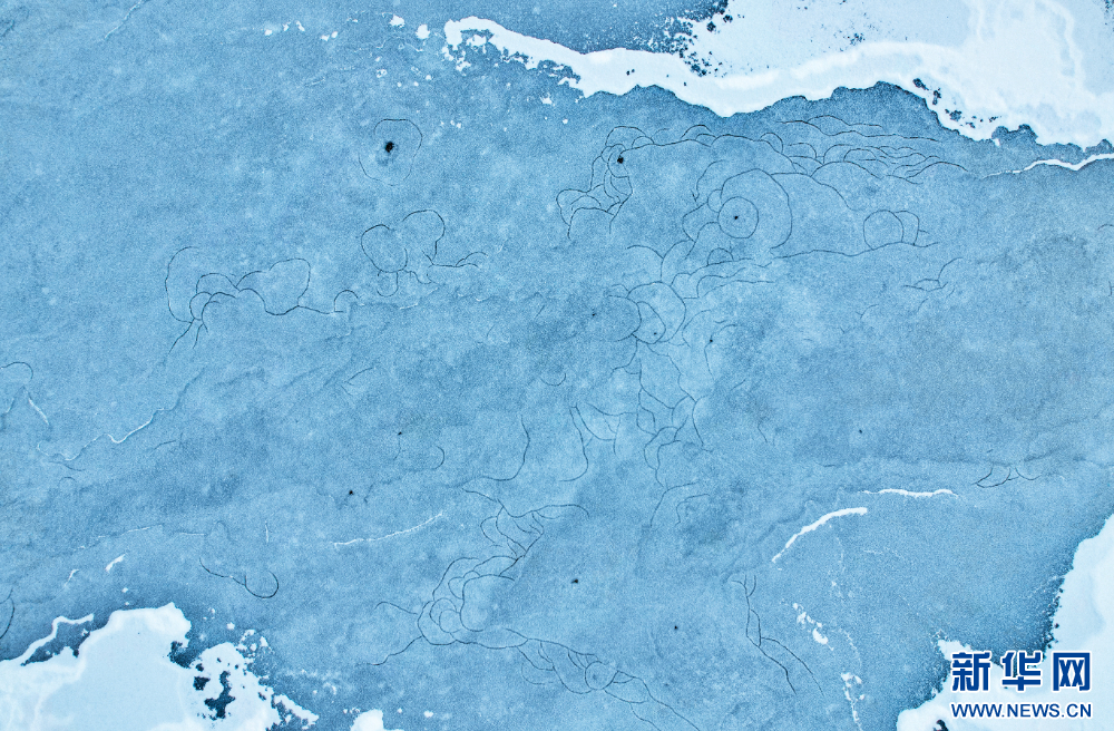 圖為1月3日降雪后扎塘魯錯(cuò)湖面自然形成的冰紋(無人機(jī)照片)。 新華網(wǎng)發(fā) 姚力 攝