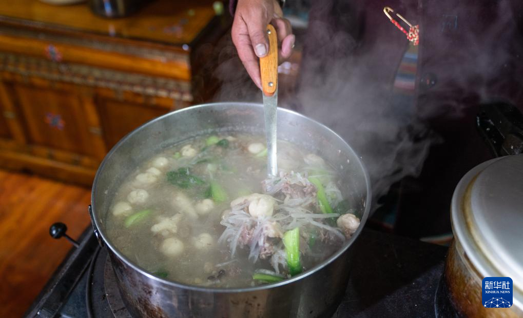 巴桑普尺盛出一碗熱氣騰騰的“古突”(1月10日攝)。新華社發(fā)(普布次仁 攝)