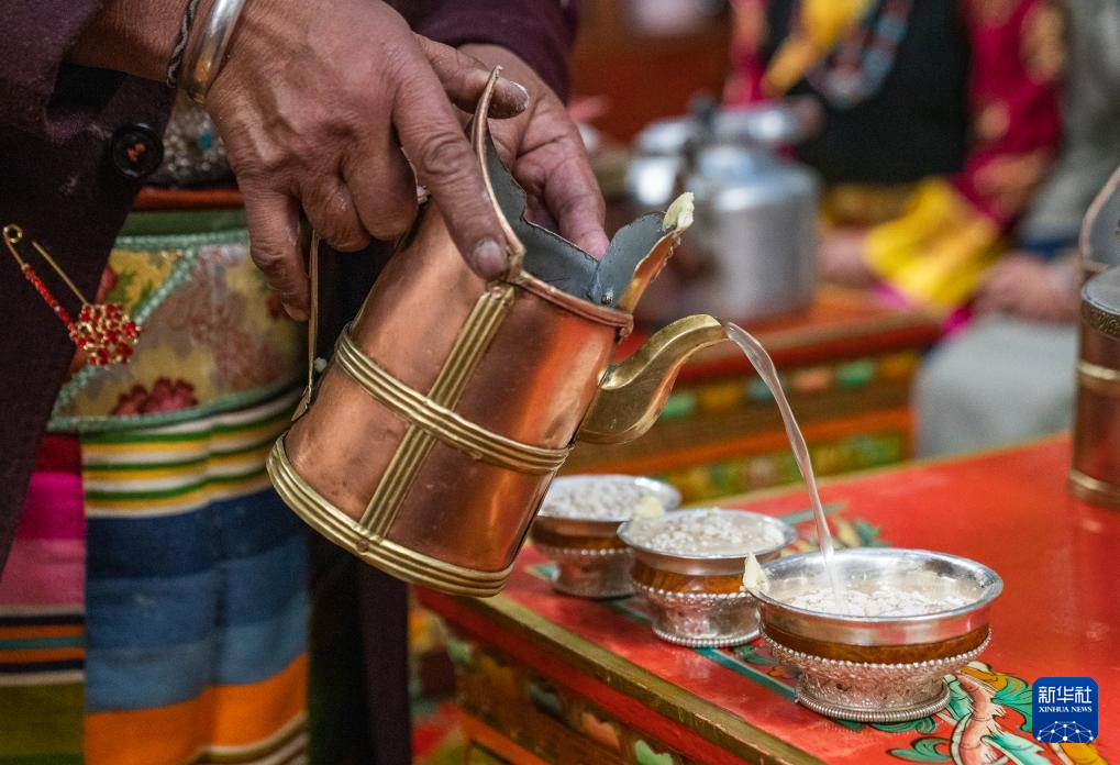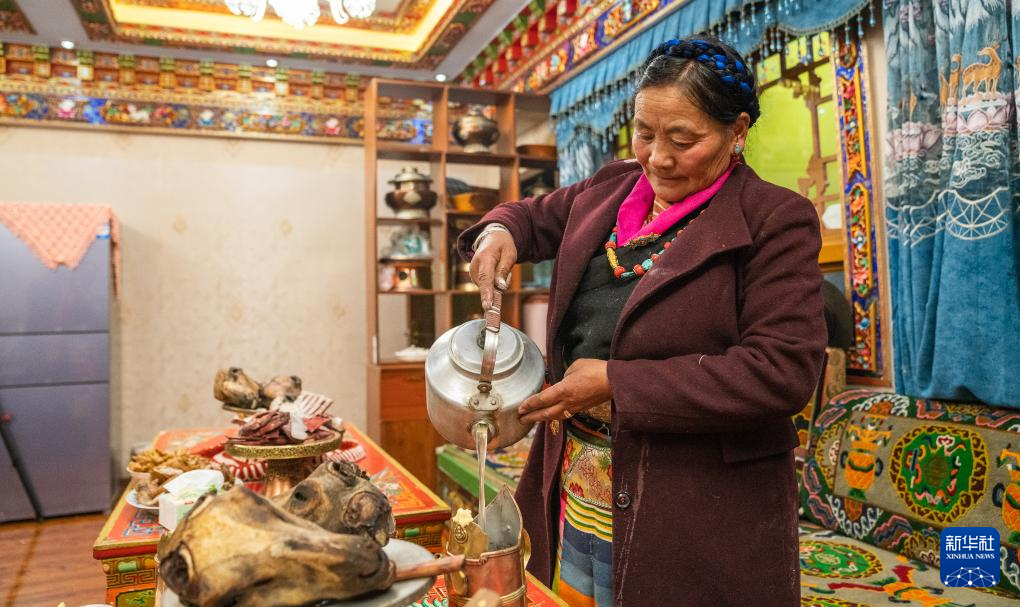 巴桑普尺在倒青稞酒(1月10日攝)。新華社發(fā)(普布次仁 攝)