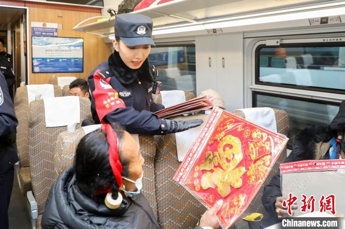 圖為春運首日,拉薩發(fā)往日喀則的C921次列車上,“格桑梅朵”乘警向旅客送“?!弊?。黃飛 攝