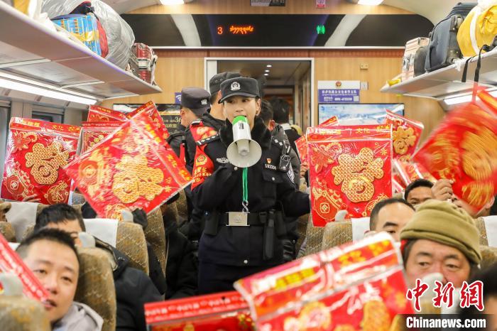 圖為春運首日,在拉薩發(fā)往日喀則的C921次列車上,乘警向旅客送上新春的祝福。黃飛 攝