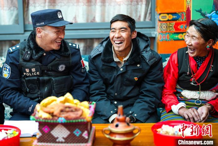 圖為崗巴邊境派出所民警嘎色與若木新村老百姓分享收獲的喜悅。葉軼 攝