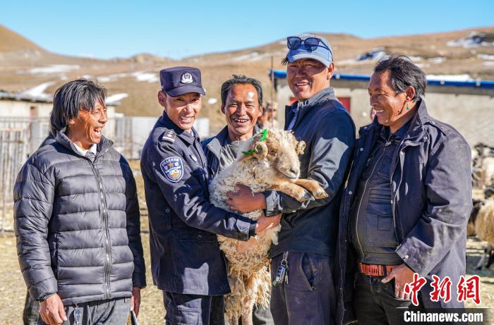 圖為崗巴邊境派出所若木新村警務(wù)室民警巴桑次仁在合作社見證分羊。葉軼 攝